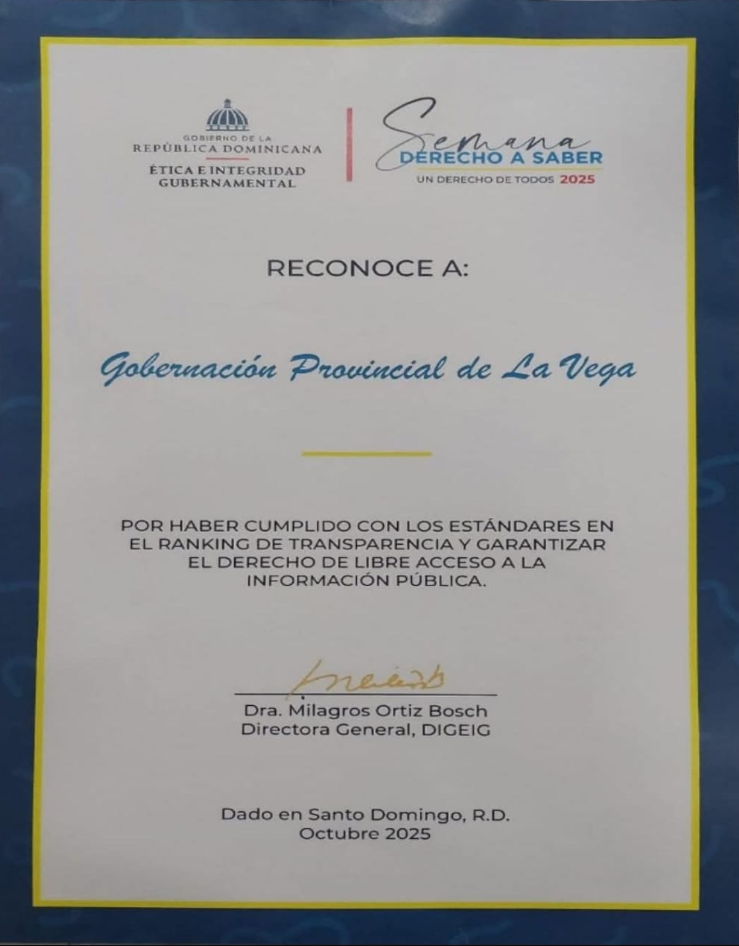 La DIGEIG reconoce a la Gobernación Provincial de La Vega que alcanza 96.78 en los Estándares de Transparencia de los meses de junio 2024 a mayo 2025, que certifica el compromiso con la publicidad de los datos en el portal institucional, la rendición de cuentas, y el cumplimiento en los plazos establecidos.